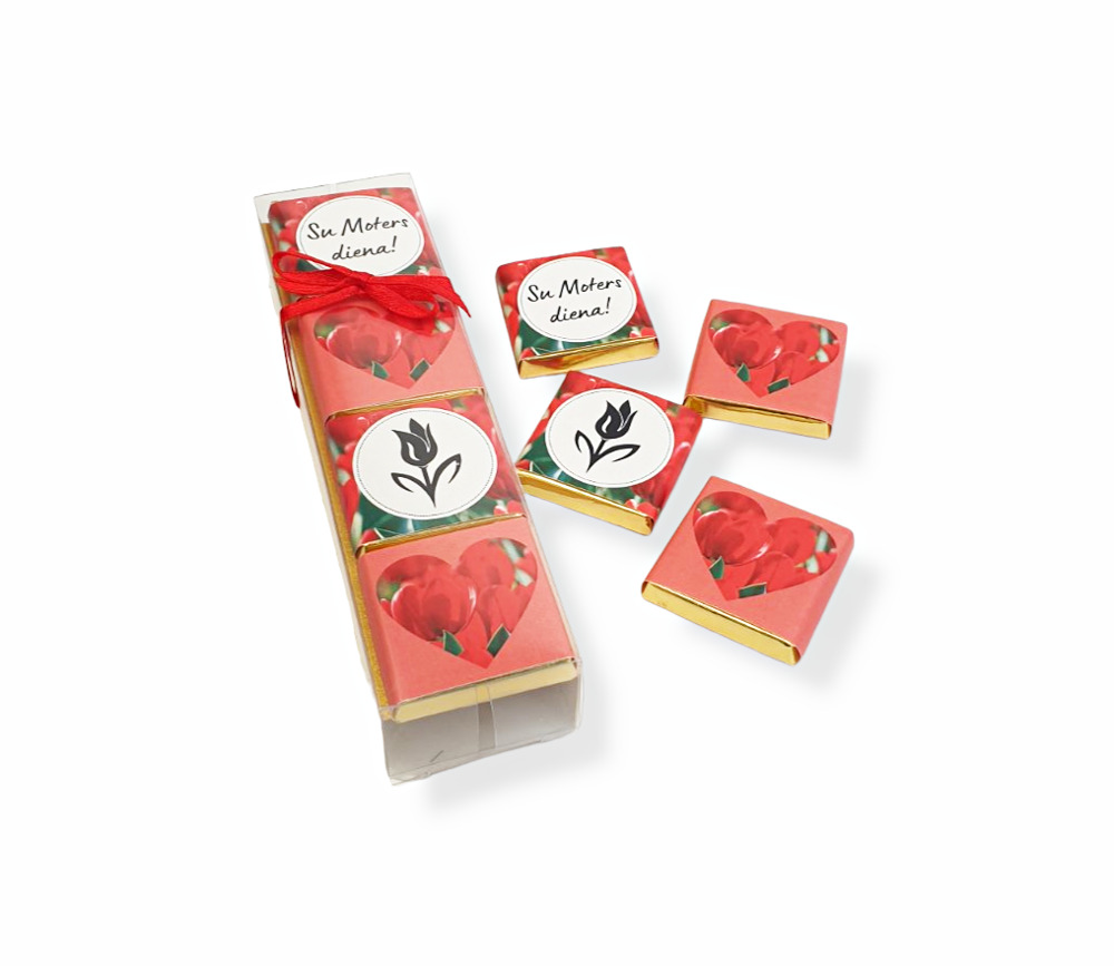 Milk chocolate: sugar, cocoa butter, skimmed milk powder, ground cocoa, emulsifier – rapeseed lecithin, flavoring agent vanillin. Cocoa solids – at least 35%, milk solids – at least 18%. Contains milk. May contain hazelnuts and wheat gluten. Store in a cool and dry place (18 ±3)º C, at a maximum relative humidity of 75%. Country of origin of dairy products: EU countries. The weight of one tile is 5 g. Manufacturer UAB “Rūta”.