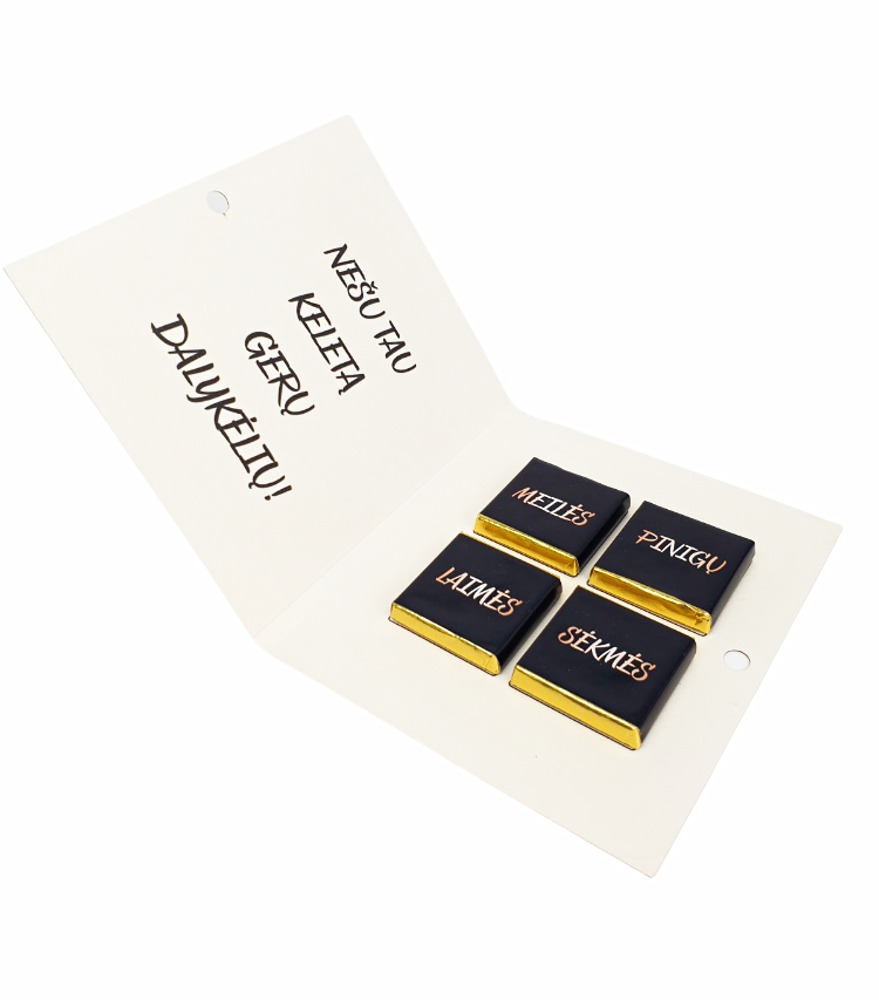 Inside you will found 4  chocolate bars. (each size is  3x3cm.)
