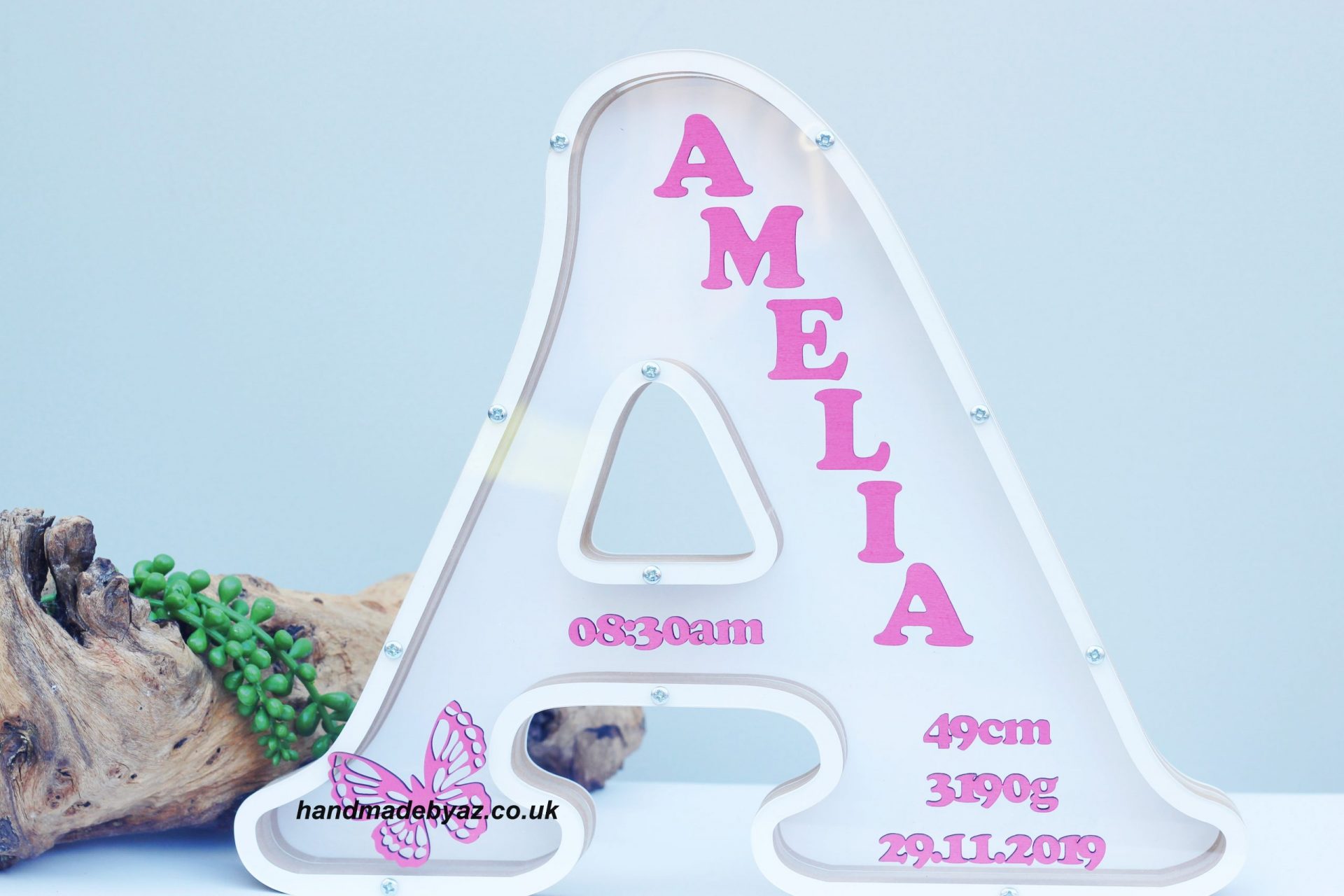 First Initial personalised to your child’s name money box, great for children room decor and saving solutions.