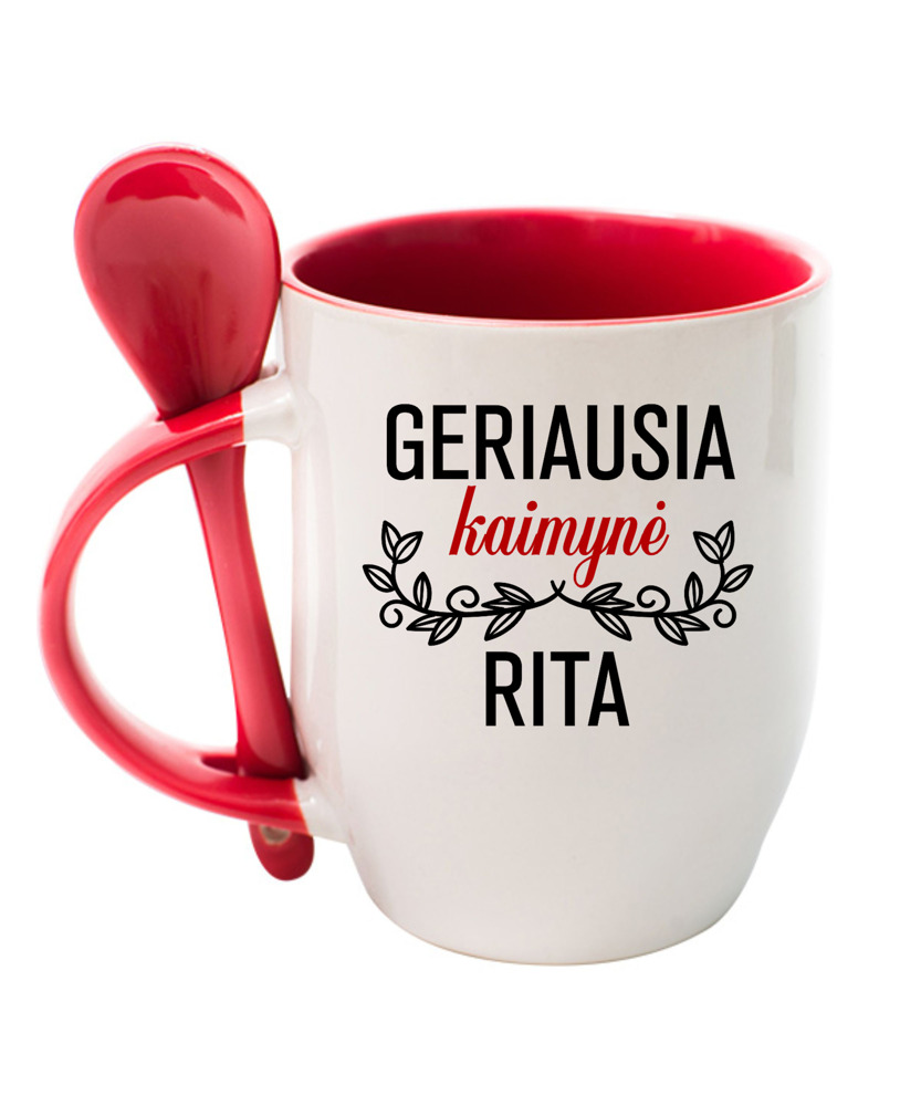 Personalised Cup with Spoon ,,Geriausia kaimyne Rita,,