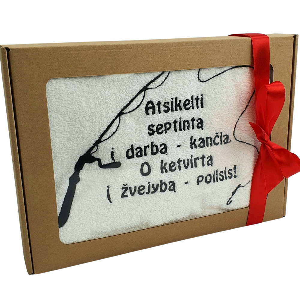 Towel with cardboard box ,,Atsikelti 7 i darba…,,