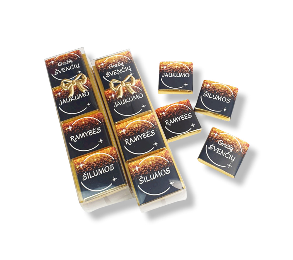 Milk chocolate: sugar, cocoa butter, skimmed milk powder, ground cocoa, emulsifier – rapeseed lecithin, flavoring agent vanillin. Cocoa solids – at least 35%, milk solids – at least 18%. Contains milk. May contain hazelnuts and wheat gluten. Store in a cool and dry place (18 ±3)º C, at a maximum relative humidity of 75%. Country of origin of dairy products: EU countries. The weight of one tile is 5 g. Manufacturer UAB “Rūta”.