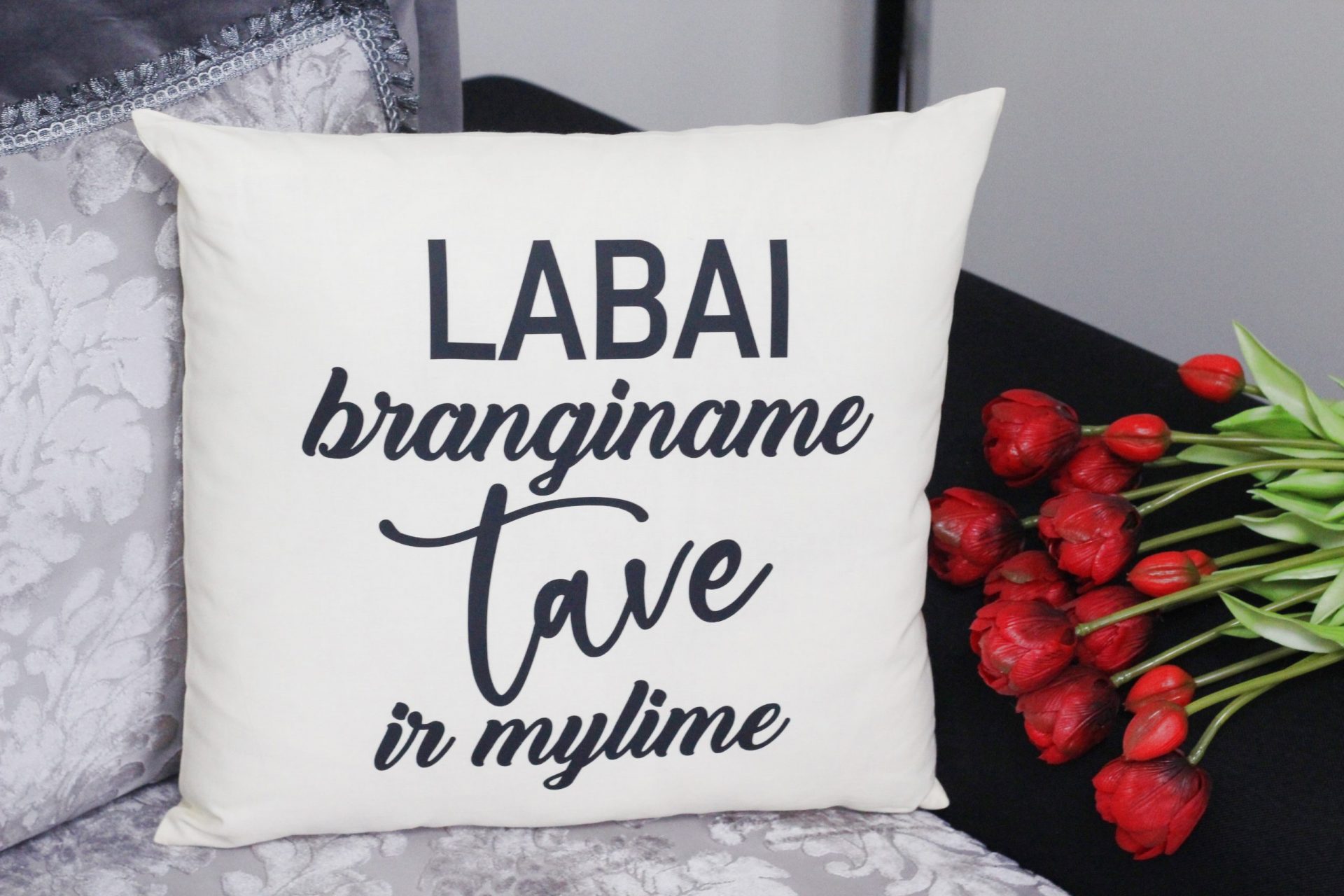 Pillow with print ,,Labai tave branginame ir mylime,,