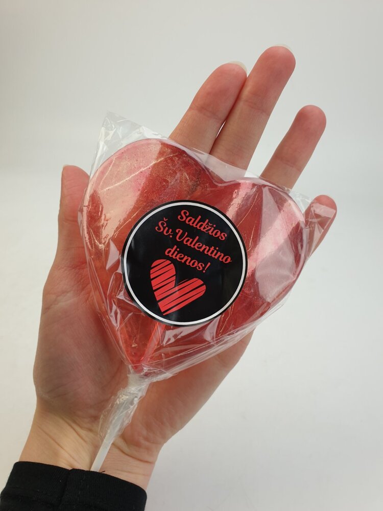 Lollipop heart ingredients: Sugar, corn syrup, flavorings, dyes E-101, E-120, E-171, E-163, E-160a, E-162, E-132.