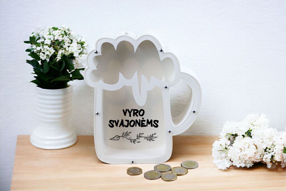 At the top of the piggy bank, coins are thrown through the dedicated cavity, and the transparent organic glass will allow you to see how many coins you have saved. The organic glass is fixed with metal screws, so in order to remove the coins, it will be possible to do this by unscrewing the screws of the piggy bank;