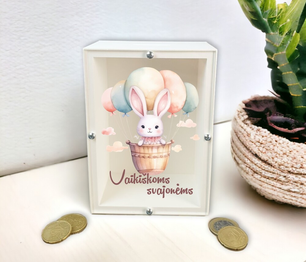 At the top of the piggy bank, coins are thrown through the dedicated cavity, and the transparent organic glass will allow you to see how many coins you have saved. The organic glass is fixed with metal screws, so in order to remove the coins, it will be possible to do this by unscrewing the screws of the piggy bank;