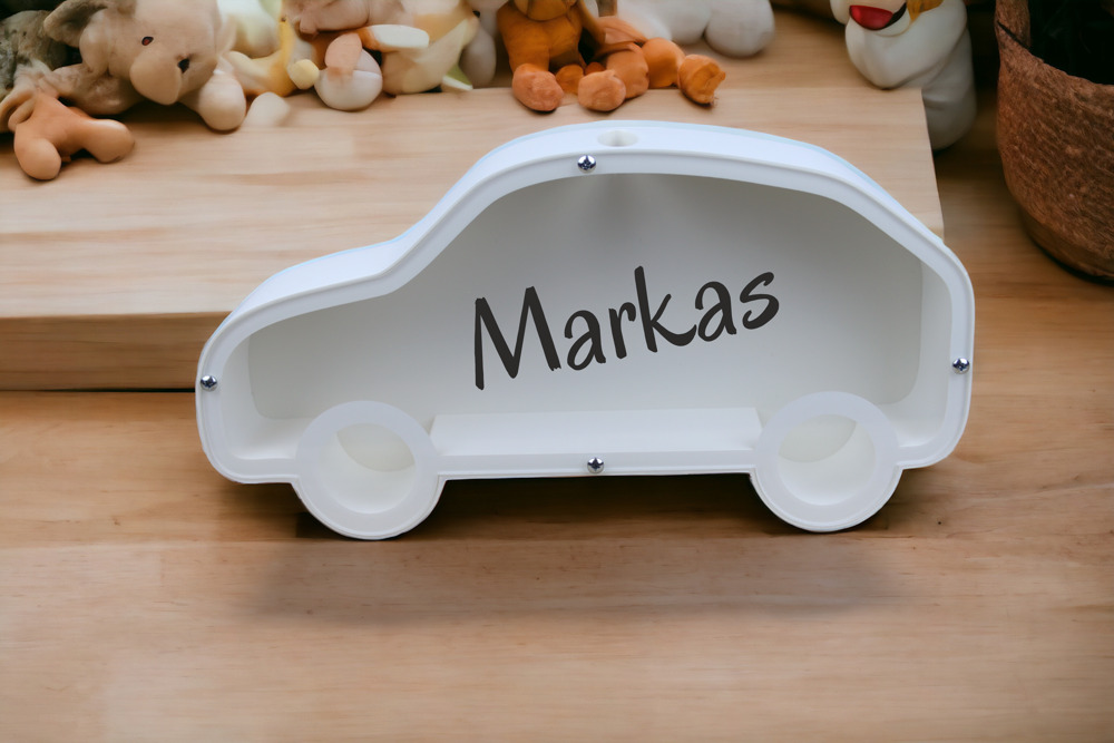 At the top of the piggy bank, coins are thrown through the dedicated cavity, and the transparent organic glass will allow you to see how many coins you have saved. The organic glass is fixed with metal screws, so in order to remove the coins, it will be possible to do this by unscrewing the screws of the piggy bank;